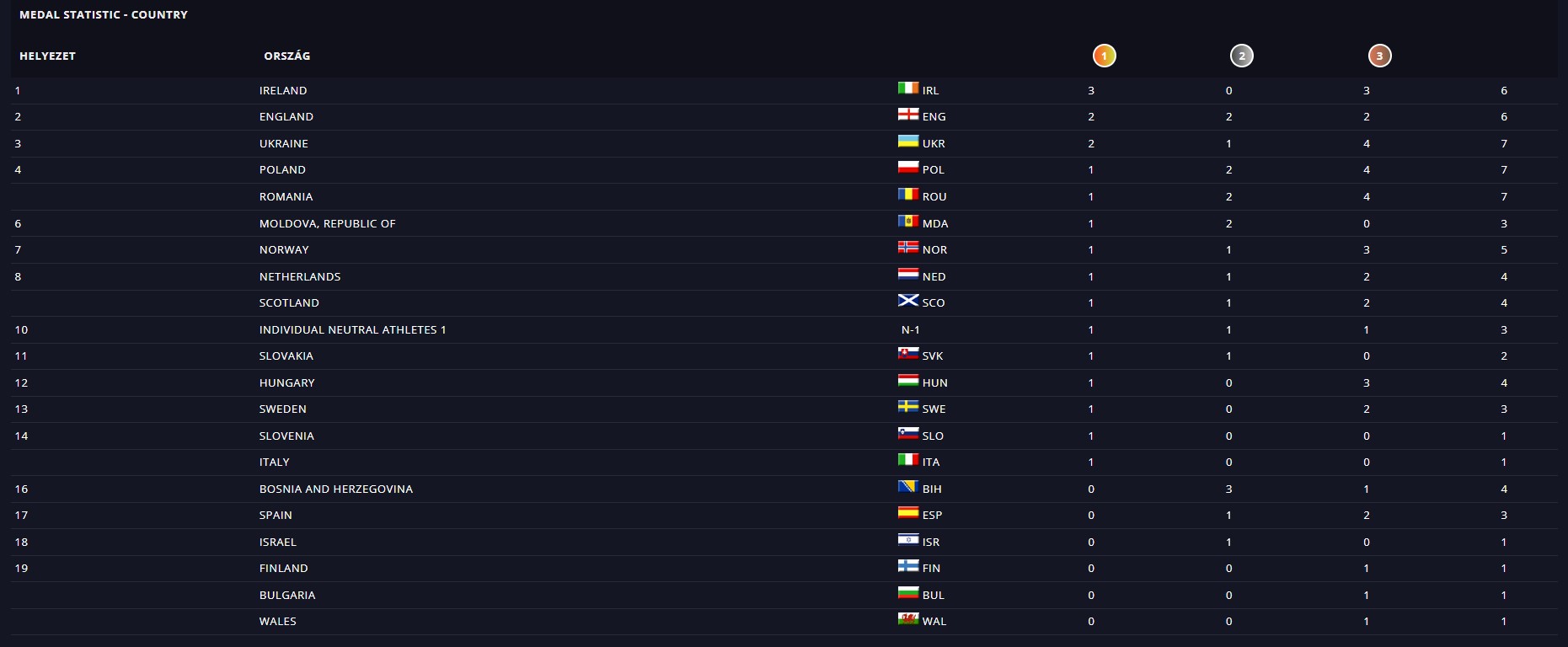 Medal Standings – Early Dominance Competition remains incredibly tight after the first full day of results. Ireland currently leads the overall standings with 3 Gold medals. However, England and Ukraine are locked in a fierce battle for second place, demonstrating incredible depth across multiple disciplines.
